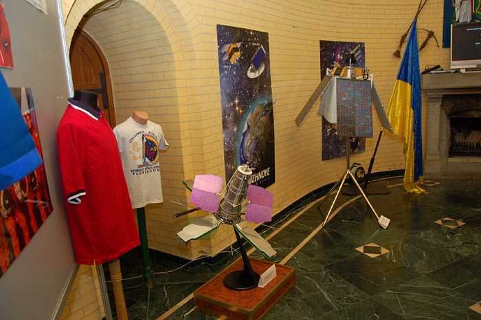 На выставке представлены макеты украинских ракет-носителей и космических аппаратов, личные вещи первого космонавта Украины Леонида Каденюка, книги и космические сувениры, символы и атрибуты, которые были в космосе, модели детского творчества.