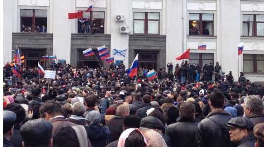 В настоящее время над зданием ОГА появился российский флаг. Толпа скандирует: «Россия!»