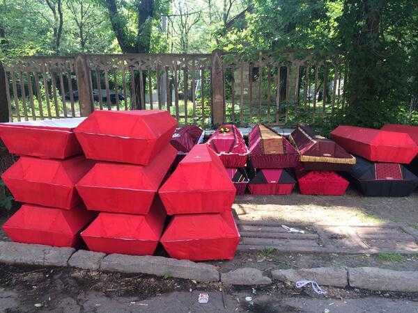 Восемь гробов с уничтоженными сепаратистами положили в грязь на дороге, а после отпевания похоронили в общей могиле под забором, больше похожей на канаву.