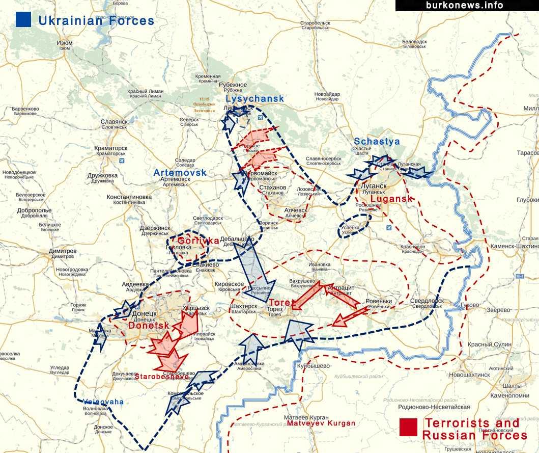 Утро началось с того, что под Ровеньками наконец-то проявились силы террористов. Местные жители, которые до этого не особо верили в наличие у них под боком такого количества сил, были удивлены появлением колонны из 16 танков и БТР, которая двинулась в сторону трассы. В 8:30 была выявлена часть колонны, которая двинулась в сторону Дьяково, скорее всего, собрались идти на прорыв в сторону РФ. Вторая часть колоны проявилась в Красном Луче, двигаясь на Снежное и дальше в Торез, куда внезапно, неизвестно откуда (для террористов) приехало пару десятков танков сил АТО.