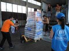В поселке Ялта руководитель украинского представительства Ангентства по делам беженцев ООН Олдрих Андрисэк и вице-губернатор Илья Шевляк передали 12 тонн гуманитарной помощи разместившимся на местных базах отдыха вынужденным переселенцам из зоны проведения активной фазы АТО.