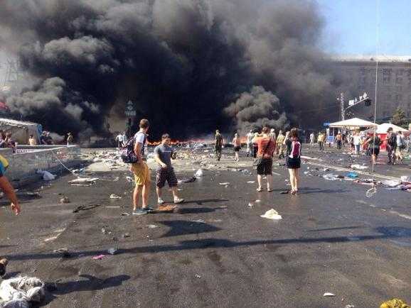 На Майдане Независимости прекратились схватки, шины догорают, коммунальщики и пожарная техника оставили Крещатик. На самом Майдане догорают дрова и шины, везде разбросан мусор, люди ведут себя спокойно, правоохранителей не видно.