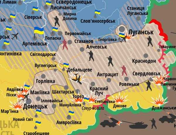 Совет национальной безопасности и обороны Украины опубликовала карту расстановки сил в зоне проведения антитеррористической операции в Донецкой и Луганской областях по состоянию на 12:00 10 августа.
