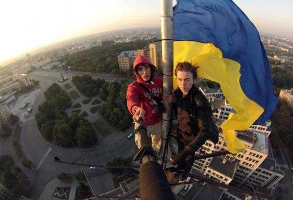 Харьковчанин Павел Иткин вместе с товарищем вывесил четырехметровое желто-голубое полотно на телебашне "Госпрома". Через несколько часов флаг исчез.