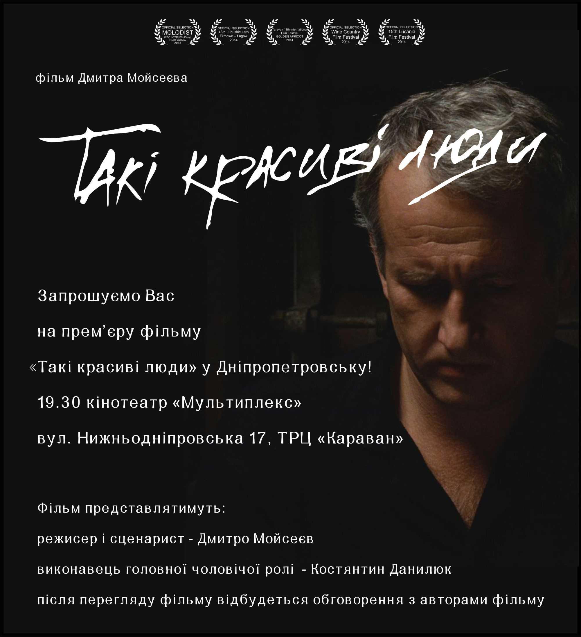 Кинокомпания "Еж Фильм" выпускает в прокат новое украинское кино. Премьера фильма под названием "Такие красивые люди" состоится в Днепропетровске 23 сентября в 19.30 в кинотеатре «Мультиплекс» ул. Нижнеднепровская 17, ТРЦ «Караван». Фильм представят:режиссер и сценарист - Дмитрий Моисеев, исполнитель главной мужской роли - Константин Данилюк.