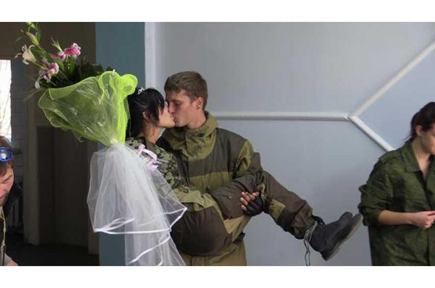"В Донецке состоялись свадьбы ополченцев. Будущие супруги познакомились на боевых позициях и решили скрепить свой союз узами брака. У одной из невест из всех свадебных атрибутов была только фата, зато другая невеста приехала на церемонию на БРДМ-2", - говорится в сообщении на сайте сепаратистов.