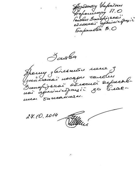 "Прошу освободить меня от занимаемой должности главы Запорожской областной государственной администрации по собственному желанию", - написал Баранов на своей странице в Facebook.