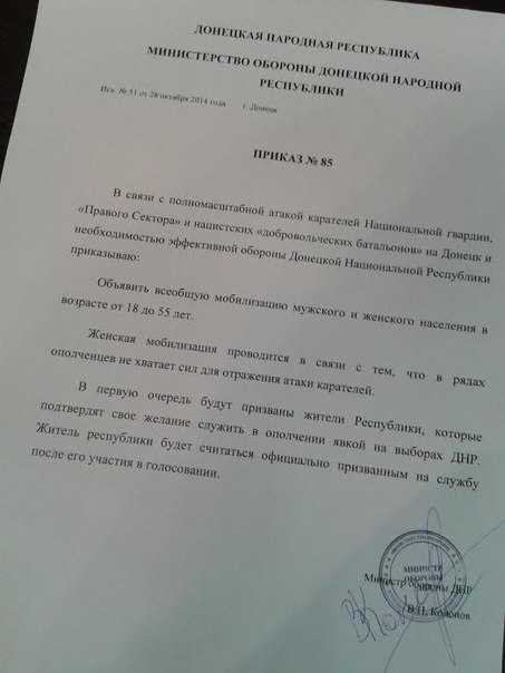 Отмечают, что такой приказ был принят «для отражения атак киевской хунты». Документ был опубликован и разослан для исполнения.
