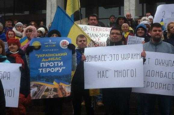 Переселенцы из Донбасса, которые были вынуждены покинуть свои дома из-за боевых действий, сегодня пришли к Украинскому дому в центре Киева выразить свой протест против «выборов» лидеров террористических республик «ДНР» и «ЛНР».