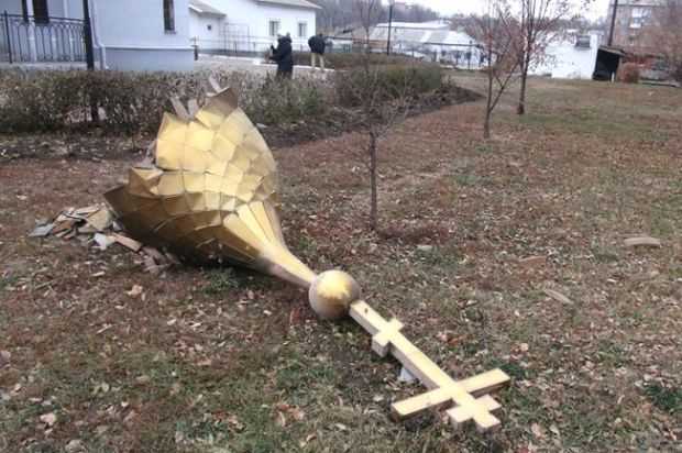 Снарядом снесло купол церкви Петра и Павла, выбиты стекла в храме, повреждены трамвайные рельсы по улице Куйбышева. СТО, которая находится через дорогу от церкви, почти полностью уничтожена.