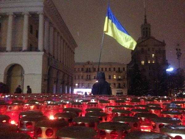 Люди с национальной символикой поют гимн, на площади горят лампадки.