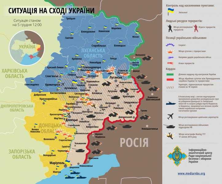 Редакция "Час Пик" Ситуация в зоне АТО по состоянию на 5 декабря 2014 Теги: Донецкаятерриториальная войнаНовости Донбасса По теме Россия уничтожила промышленность Донбасса - люди вынуждены работать за едуВСУ освободили девять населенных пунктов на Очеретинском направлении и сдерживают РФ под ПокровскомВ Донецкой области после российского обстрела поврежден аммиакопровод "Одесса-Тольятти" - ВСУ