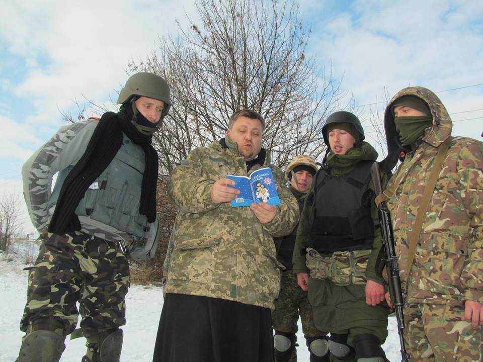 Накануне Рождественских праздников на юге Донетчины в полевых расположениях участников АТО побывал военный капеллан Поликарп, который поздравил украинских воинов с наступающим праздником и провел богослужение.