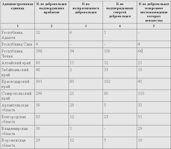 За период с августа по декабрь 2014 года на территорию Украины было переброшено 3355 наемников завербованных государственными органами РФ на территории РФ (столбец №2). Из них вернулось домой в различной степени целостности - 721 (столбец №3). Погибли, отрабатывая свои деньги - 626 (столбец №4)