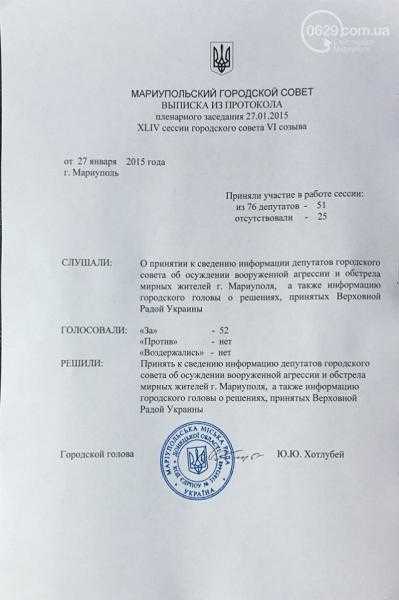 Мэр Мариуполя Юрий Хотлубей, который вел сессию, поставил предложение на голосование: «Да, давайте проголосуем за это предложение, надо осудить агрессию».