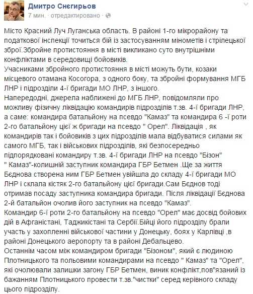 "Город Красный Луч Луганская область. В районе 1-го микрорайона и налоговой инспекции идет бой с применением минометов и стрелкового оружия. Вооруженное противостояние в городе вызвано сугубо внутренними конфликтами в среде боевиков", - об этом на своей странице в ФБ написал Дмитрий Снегирев.