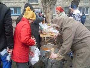 В Луганске люди вынуждены часами стоять в очередях, чтобы получить горячее питание, которое раздают местные волонтеры.