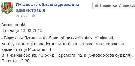 В открытии больницы примет участие руководитель Луганской областной военно-гражданской администрации Геннадий Москаль. Мероприятие состоится по адресу: г. Лисичанск, кв. 40 лет Победы, 12 а (5-этажное здание). Начало 12:30.