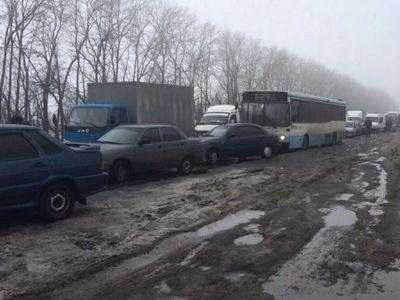 Максимильяновка, один из контрольных пунктов на линии разграничения с украинской стороны. В сторону Донецка стоят две очереди: в одной около 180 легковых автомобилей (сбился со счёту), в другой 24 автобуса (сосчитал точно).