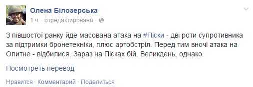 "С полшестого утра идет массированная атака на Пески - две роты противника при поддержке бронетехники, плюс артобстрел", - написала Елена Белозерская у себя в Facebook.