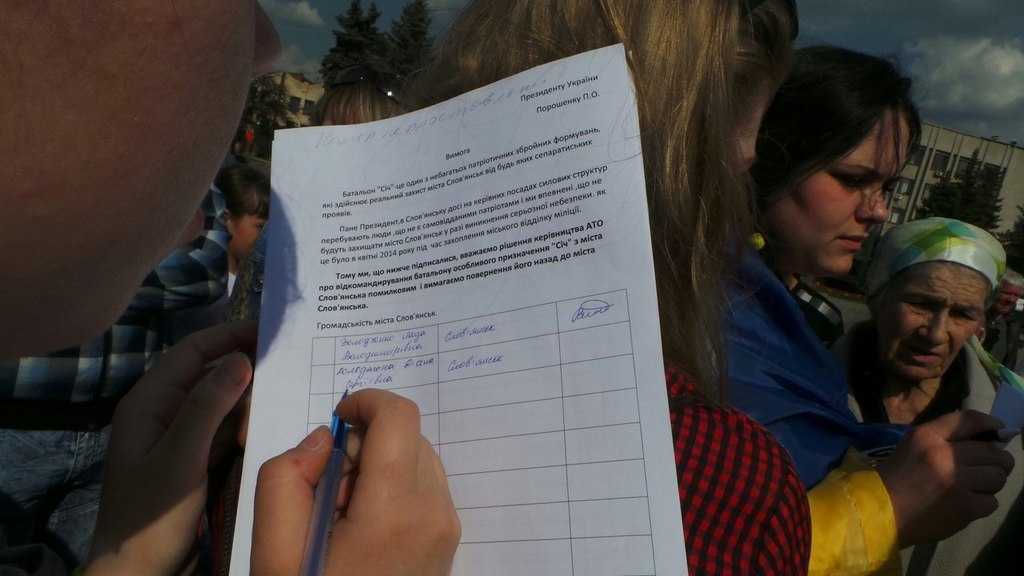 Жители Славянска (Донецкая область) требуют вернуть бойцов добровольческого батальона "Сич" в свой населенный пункт.
