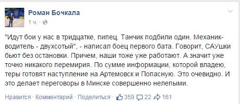 "Идут бои у нас в тридцатке, пипец. Танчик подбили один. Механик-водитель - двухсотый", - написал боец первого бата. Говорит, САУшки бьют без остановки. Причем, наши тоже уже работают. А значит уже точно никакого перемирия. По сумме информации, которой владею, теры готовят наступление на Артемовск и Попасную. Это очевидно. И это делает переговоры в Минске совершенно нелепыми". - написал Бочкала.