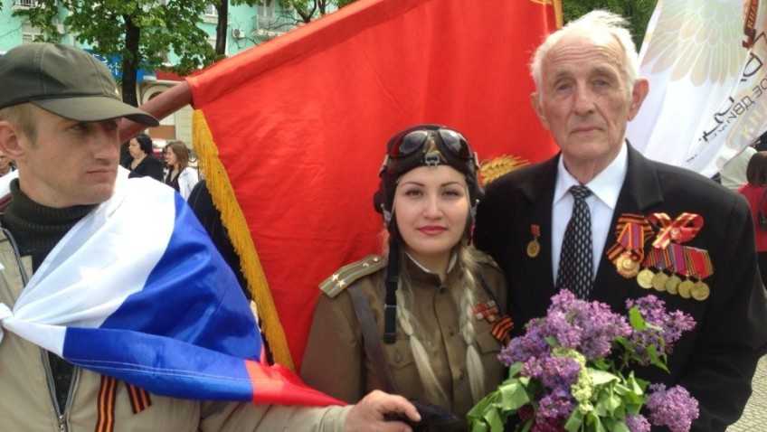 Лидер сепаратистской организации "Луганская гвардия" и видная участница луганского антимайдана стриптизерша Анастасия Пятерикова 9 мая удивила жителей Луганска новым экзотическим нарядом. Правда, на этот раз она предстала перед луганчанами не в эротическом белье, а в форме подполковника советской авиации. При этом на груди у Пятериковой красовались награды ветерана войны.