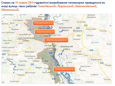 Также отмечается, что по состоянию на 15 мая гидравлические испытания теплосетей проводятся на ряде улиц в Голосеевском, Подольском, Шевченковском и Оболонском районах.