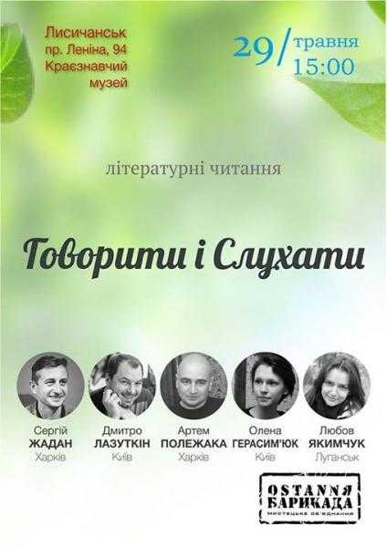 В Лисичанск приедут украинские поэты из Луганска, Харькова и Киева. Это Сергей Жадан, Артем Полежака, Дмитрий Лазуткин, Любовь Якимчук, Елена Герасимьюк.