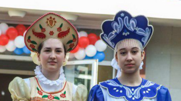 Выпускников нарядили в русские народные костюмы: девочкам достались разноцветные кокошники, мальчикам рубахи с хохломой. На праздновании в образцово-показательной школе присутствовал сам Иосиф Кобзон, который в последнее время зачастил в гости к боевикам.