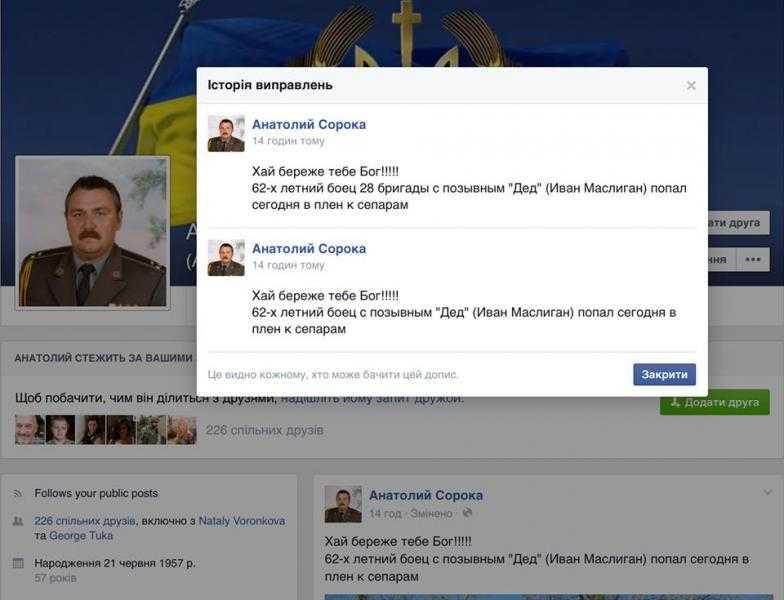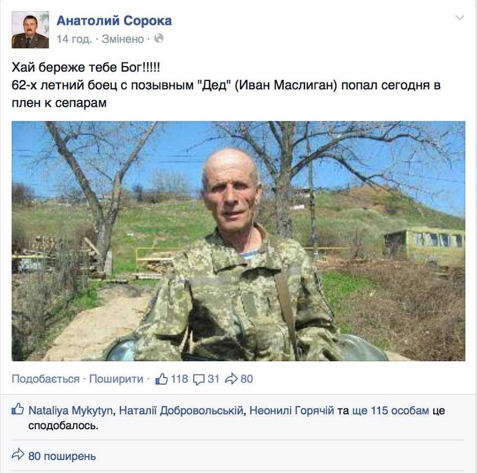 "Некто Анатолий Сорока 14 часов назад разместил у себя слезоточивый пост о том, что Иван Маслаган (позывной Дед) попал в плен к сепарам", - пишет в Фейсбуке известный волонтер Юрий Бирюков.