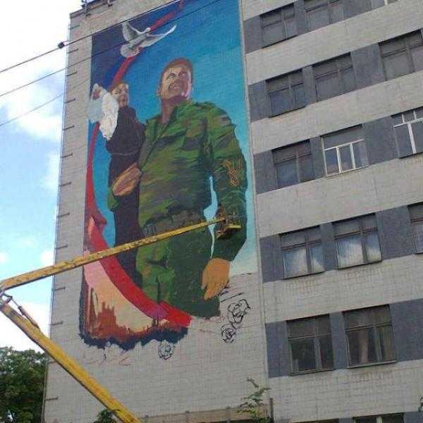 В Донецке на одном из корпусов технического университета, ныне захваченного сепаратистами, появилось 15-метровое изображение террориста с ребенком. На фасаде здания третьего корпуса, практически от фундамента и до самой крыши, нанесен рисунок боевика в камуфляже с «георгиевской лентой» на рукаве.