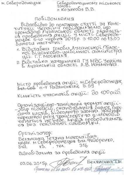 "5 июня с 10:00 в г. Северодонецк, возле здания ЛОВЦА (пр-т Советский 59) будет проводиться акция с требованием отставки главы ЛОВЦА Москаля Г.Г. и начальника ГУ МВД Украины в Луганской области Науменко А.В".