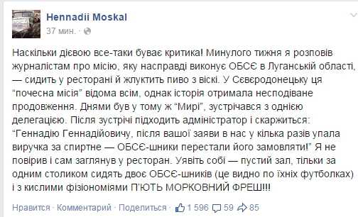 "Насколько действенной все-таки бывает критика! На прошлой неделе я рассказал журналистам о миссии, которую на самом деле выполняет ОБСЕ в Луганской области, — сидит в ресторане и пьет пиво с виски", - об этом на своей странице в Фейсбуке написал Геннадий Москаль.