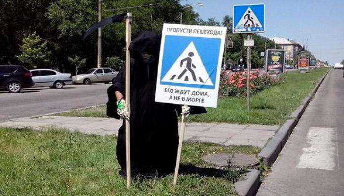 Местные активисты вывели на центральные дороги Запорожья... смерть с косой. Необычные персонажи стояли на «зебрах» и напоминали водителям о правилах дорожного движения. Ведь, по словам местных, именно на «зебре» одного из оживленных проспектов города автолюбители часто «забывают» пропускать пешеходов.