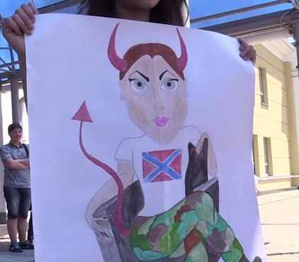 Депутат от Оппозиционного Блока Наталья Королевская посетила освобожденный от сепаратистов Славянск. Местные жители были не очень рады такому визиту и приготовили для неё подарок — траурный венок на шею, в память о тех, кто погиб в её копанках.