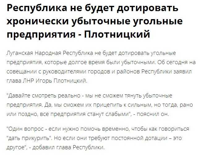 Луганские коммунисты на митингах ещё в 2013 г. предрекали ужасающее будущее Донбасса в случае вступления Украины в Евросоюз. Донбасс максимально отдалился от Европы, оградив себя огромной армией боевиков, но Европа, которую рисовали для шахтеров коммунисты все же их настигла. Лидер ЛНР Игорь Плотницкий заявил, что «республика» не будет дотировать угольные предприятия, которые являются убыточными. Те самые предприятия, которые раньше дотировались Украиной.
