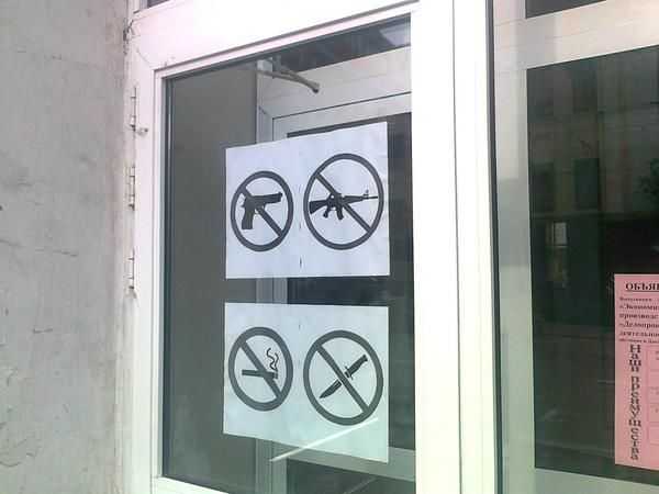 В объявлении на двери перечислены «преимущества» заведения, а также ограничения: не рекомендуется входить с огнестрельным и холодным оружием, а также с дымящейся сигаретой