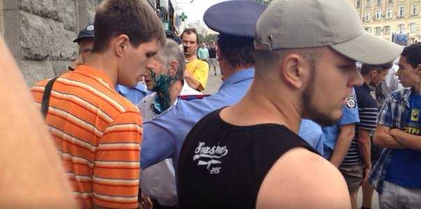 Депутата Харьковского городского совета от Коммунистической партии Украины Алексея Перепилицу активисты облили зеленкой в ответ на призывы не признавать Россию страной-агрессором. Милиция защищала депутата и оттеснила толпу.