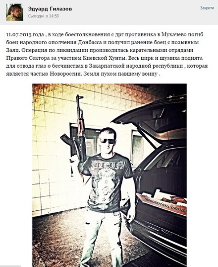 Операция по ликвидации производилась карательными отрядами Правого сектора при участии Киевской Хунты. Весь цирк и шумиха поднята для отвода глаз о бесчинствах в Закарпатской народной республики, которая является частью Новороссии. Земля пухом павшему воину", - утверждает террорист.