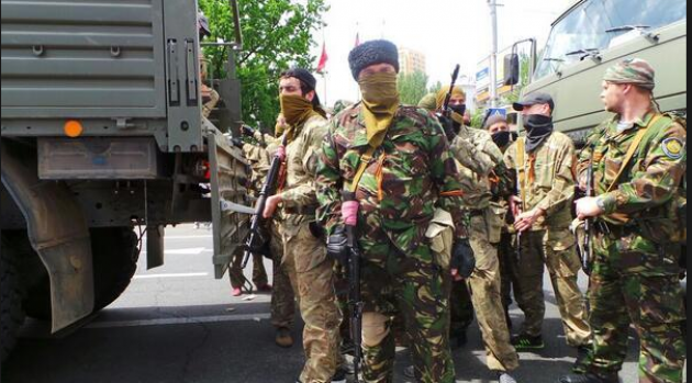Террористы оцепили центр Донецка и расставили вооруженную охрану с собаками.