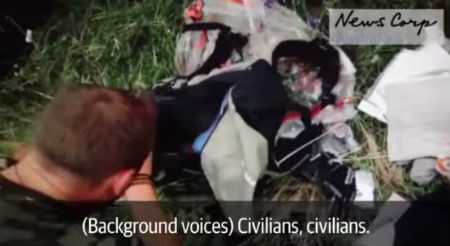 Один из боевиков раскрывает рюкзак погибшего пассажира, выбрасывая на землю вещи. Одновременно автор съемки показывает в камеру удостоверение стюардессы и говорит, что все пассажиры лайнера "иностранцы, малайзийцы". После этого сепаратисты начинают обыскивать вещи погибших в поисках телефонов и документов.