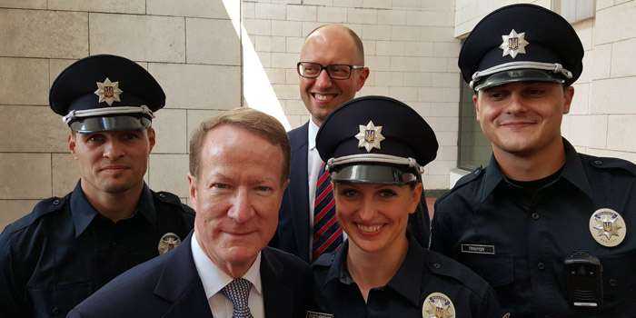 Премьер-министр Украины Арсений Яценюк и заместитель Государственного секретаря Соединенных Штатов Америки Уильям Браунфилд сделали селфи с сотрудниками патрульной полиции Киева.