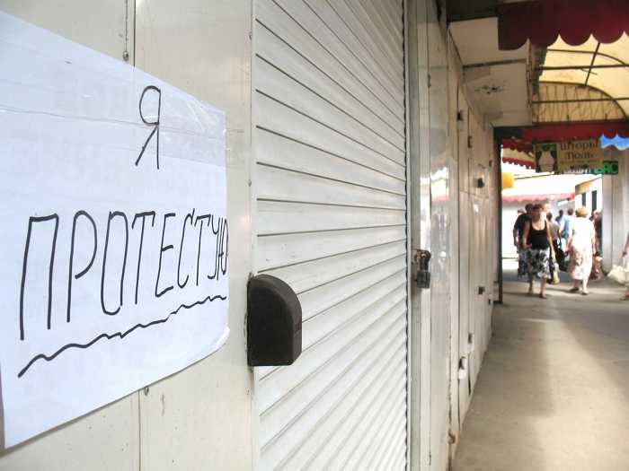 Акция протеста имела весьма необычный формат – у протестующих были наглухо закрыты ларьки и модули центрального рынка Луганска, на которых были прикреплены листики бумаги с надписью «Протестую!»