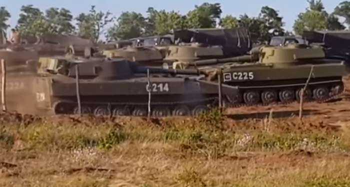 На видео можно увидеть самоходные артиллерийские установки, другую военную технику.