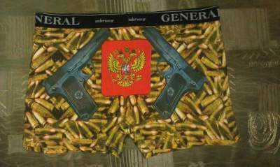 Дизайнеры создали мужское нижнее белье с россйиским гербом на "самом интересном месте" и двумя пистолетами по бокам.