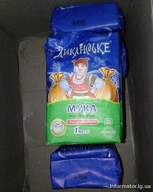 Среди продуктов питания в наборе было: 5 кг пшеничной муки, 1л. растительного масла, 2 кг гречки, 3 кг риса, 1 кг сахара, 3 кг макарон, 180г чая, 4 банки рыбных консерв (сардина) по 240 г, 2 банки говяжьей тушенки по 525 г, 10 пакетиков дрожжей.