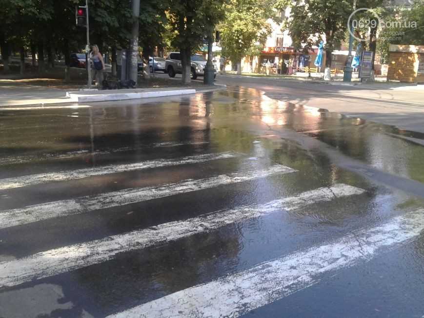 Проспект Металлургов, от зала регистраций, залит водой, которая льется по проезжей части. Пострадала частично пешеходная дорожка и пешеходный переход. Об этом сообщает сайт 0629.