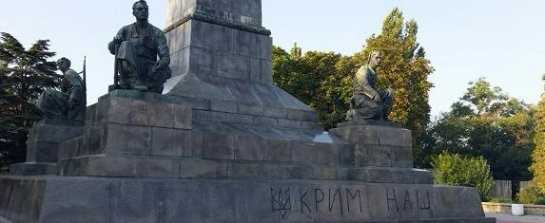 На постаменте «вождя пролетариата» появилась надпись на украинском языке, гласящая «Крым наш», а рядом герб Украины.