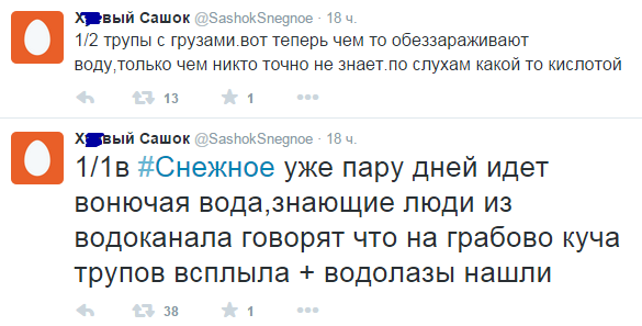 @SashokSnegnoe: в #Снежное уже пару дней идет вонючая вода,знающие люди из водоканала говорят что на грабово куча трупов всплыла + водолазы нашли трупы с грузами.вот теперь чем то обеззараживают воду,только чем никто точно не знает.по слухам какой то кислотой.